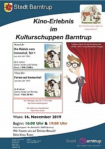 In Kooperation mit der Stadt Barntrup können wir Ihnen dieses Kino-Erlebnis im ansprechenden Ambiente des Barntruper Kulturschuppens KOSTENLOS anbieten. Für die entsprechende Kino-Stimmung sorgen ein Popcorn-Automat und Getränke, die zum Selbstkostenpreis verkauft werden.
